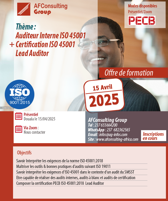 Vous souhaitez devenir auditeurs ISO 45001 et réaliser des missions d’audit interne, audit à blanc et audit de certification tout en étant reconnus comme un expert international dans le domaine ? cette formation est la vôtre. Elle vous permettra Acquérir les compétences d’un auditeur dans le but de planifier un audit, diriger un audit, rédiger des rapports et assurer le suivi d’un audit, en conformité avec la norme ISO 19011. A la fin de la formation, Vous composerez l’examen PECB Certified ISO 45001 Lead Auditor dans notre centre d’examen PECB online. Inscrivez-vous dès maintenant.